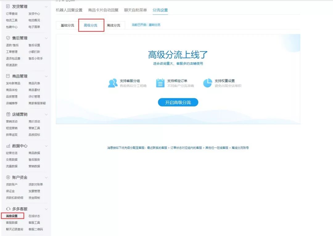 进入商家管理后台-【多多客服】-【消息设置】-【分流设置】,找到【高级分流】。