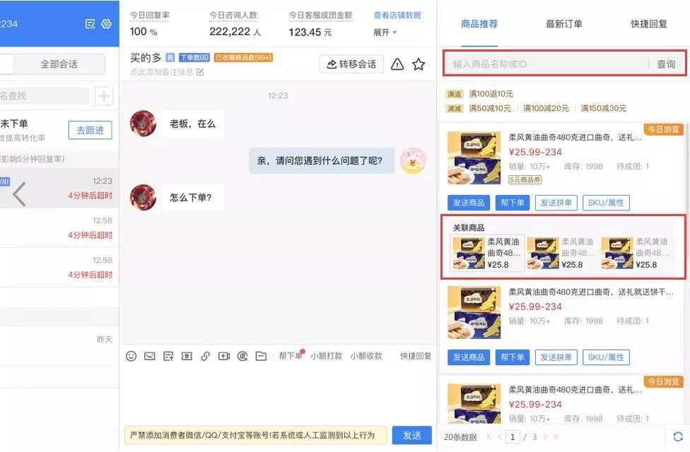 商家进入网页端客服平台,在右侧找到【商品推荐】,可以选择推荐对应商品的关联商品或者直接快速搜索商品。