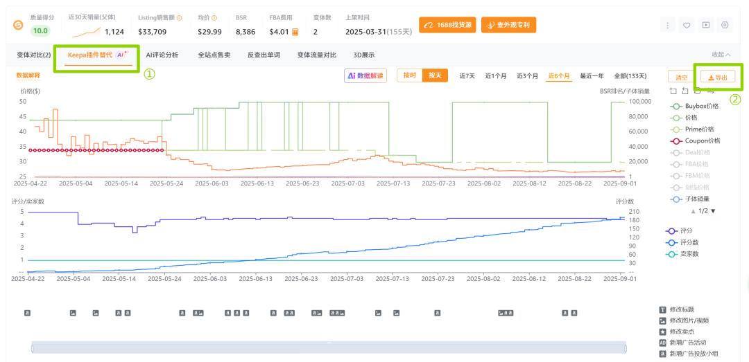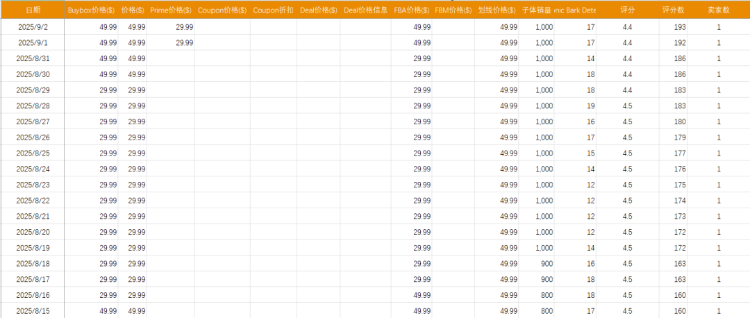登入sif、卖家精灵或者类似插件,从Keepa插件替代页面进入,导出内容,就可以得到一个包含日期、价格、销量、BSR排名、评分、评分数、卖家数的表格,这个就是我们分析的基础表
