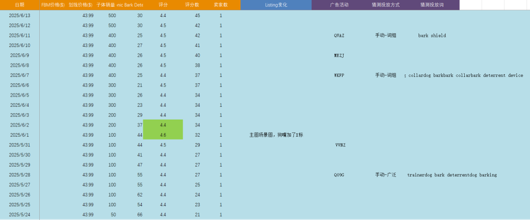 在keepa插件页面,除了上述数据,还可以监控到listing的变化(标题、图片、卖点)以及新增广告活动的操作。但是这一部分数据是无法下载导出的,需要我们自己手动添加。在下载的基础表格里面,新增两列,一列是“listing变化”,另外一列是“广告活动”。“lisiting变化”那一列,主要是简述一下链接做了什么修改。