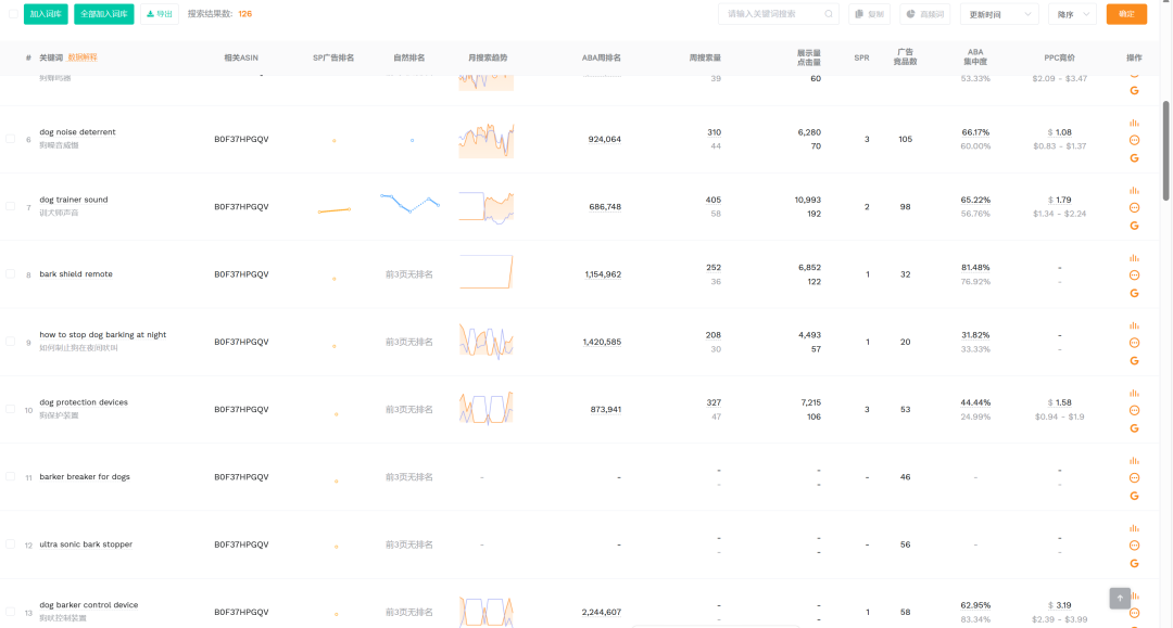如下图,我们可以看到这个广告组的搜索词数波动较大,搜索词较分散,没有相同的词根,且搜索出来的词和产品的相关性较高,初步判断这个是自动广告的紧密匹配。
