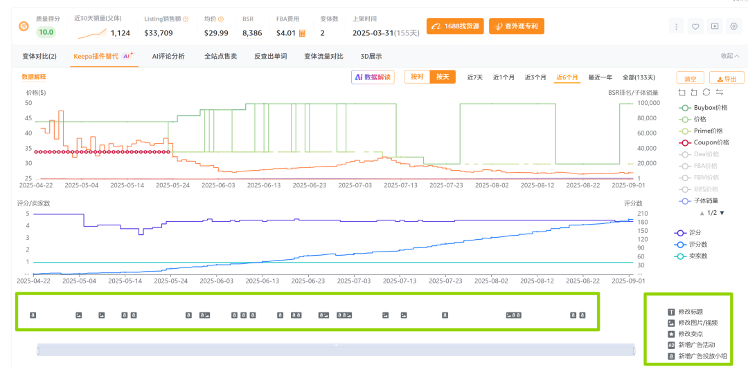 根据FBA价格曲线和Buybox,以及BSR排名的变化,来判断是否断货以及补货时间。重点观察断货前的操作,和到货后的重新推广手段。