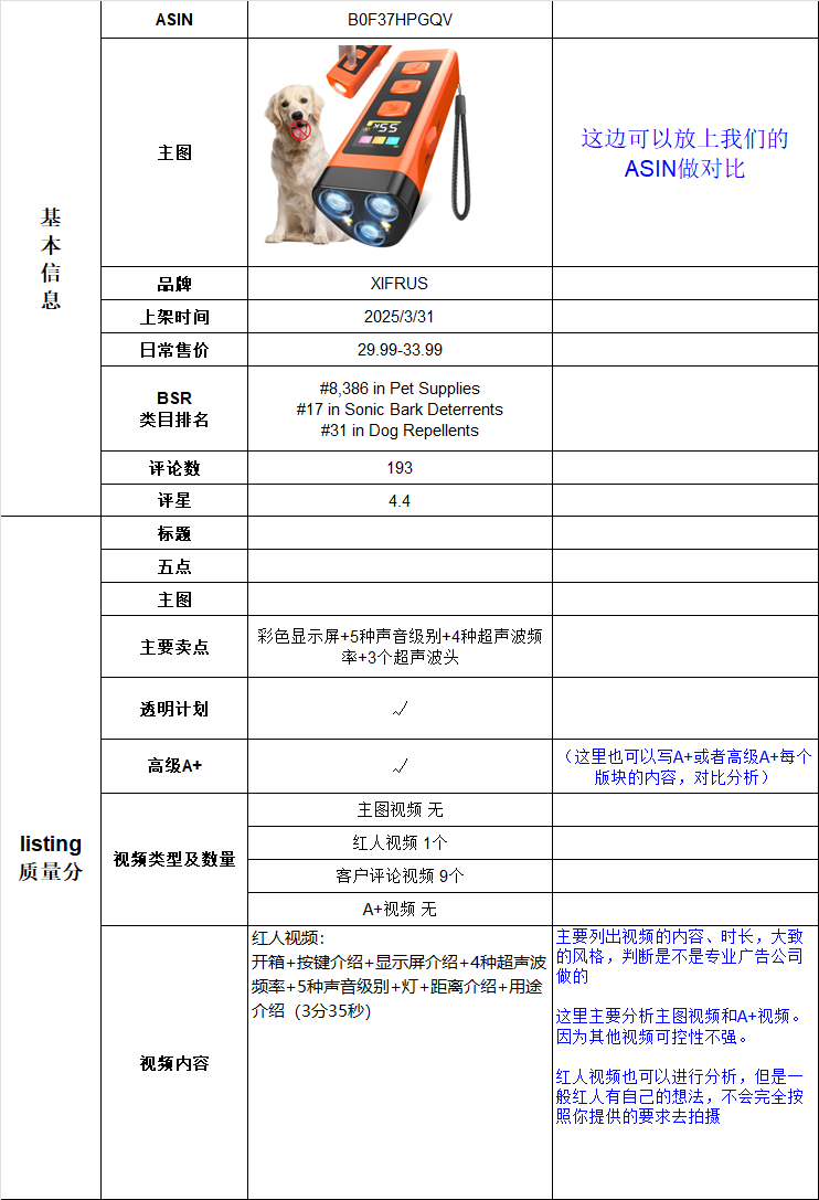 在确定了目标竞对之后,我们可以初步记录目标竞对的基本信息,例如ASIN、品牌、上架时间、日常售价、BSR、类目排名、评论数、评星等。同时可以与我们链接的标题、五点、关键词布局、主图、A+模块、高级A+、视频数量进行对比。