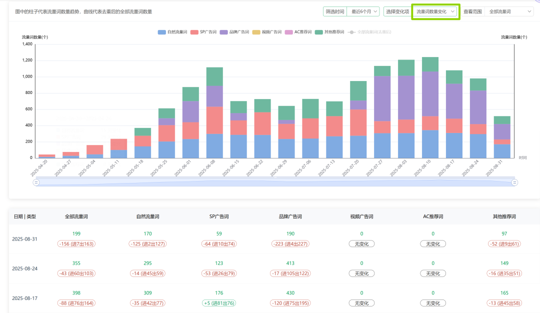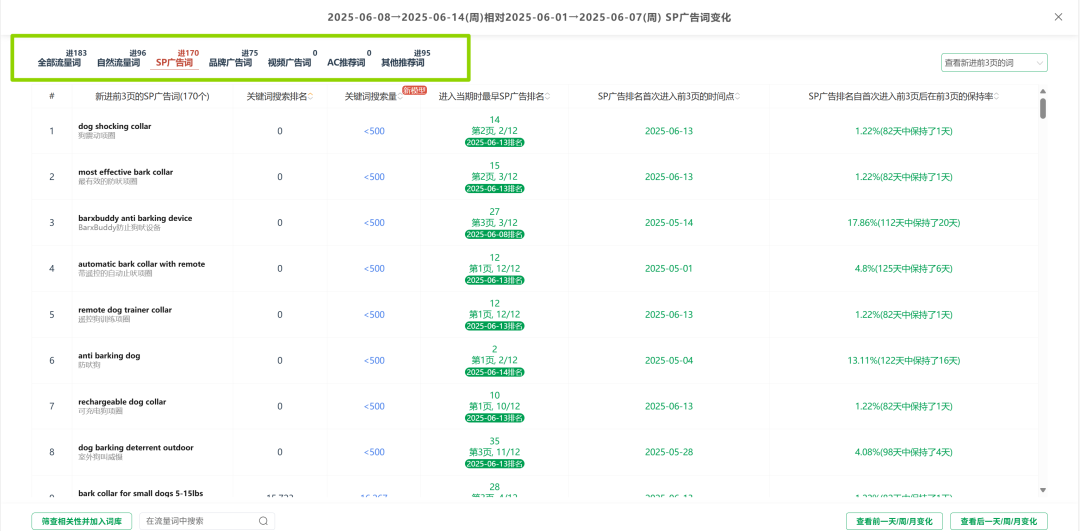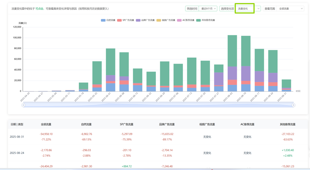 通过这个工具,我们可以初步判断竞对是靠广告、自然单,还是流量突然暴涨。结合第四步记录的新增广告组、BSR排名变动,以及流量时光机的流量占比、流量词变化,可以让我们更好的判断广告的效果,以及是否存在站外推广的方式。