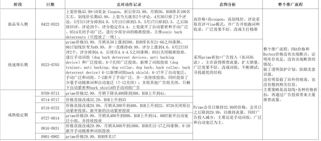 主要是把竞品关键动作(价格促销折扣、广告、站外、评论获取手段)标注出来,以及对应的结果(排名和销量的变化),形成类似下面的表格,方便观看。