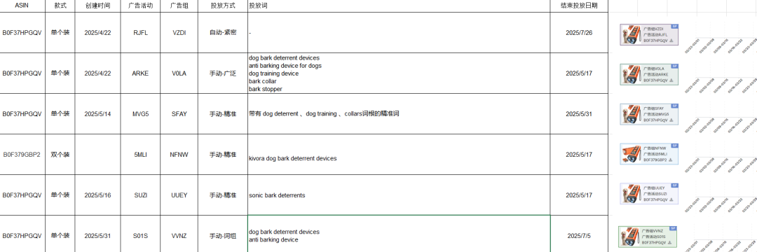 完成这一步之后,我们把对应的猜测投放方式和投放词同步到Keepa数据那份表格中,我们就获得一份含关键词广告在内的竞品数据表。