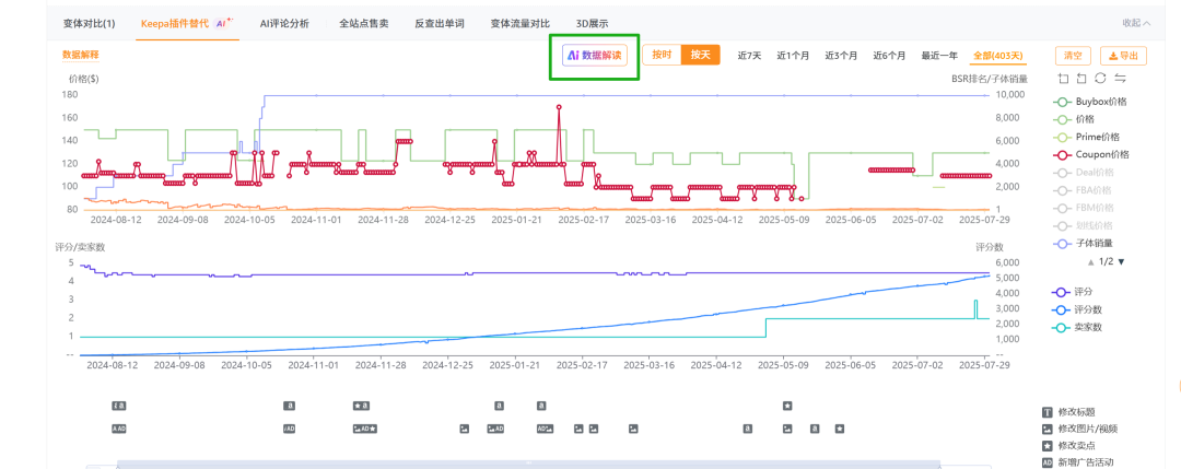 卖家精灵的keepa插件页面里面新增了AI数据解读,可以直接生成分析报告。我们可以将自己的分析和导出的报告做一个对比,查缺补漏。在不需要那么精细的分析下,也可以直接用这个报告做一个大概的判断。
