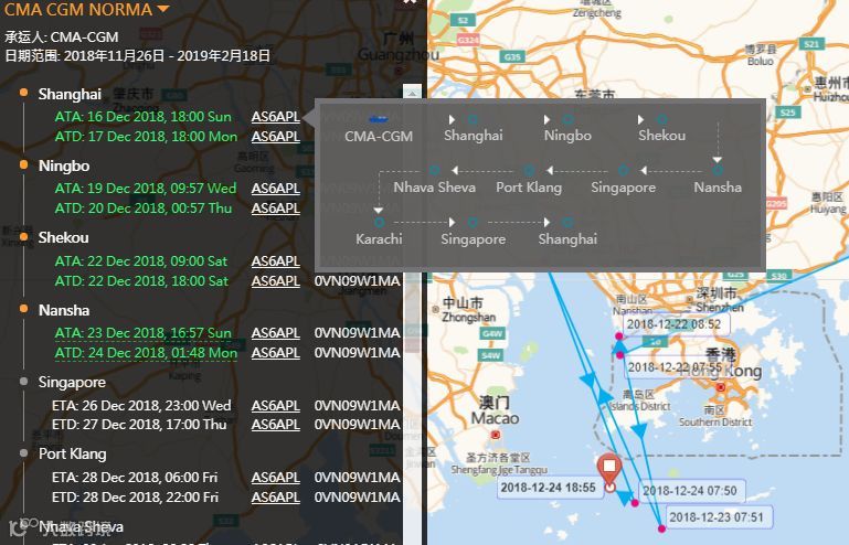 来自大船期数据显示,“CMA CGM NORMA”集装箱挂靠上海、宁波、蛇口、南沙港口;涉及多家承运人共舱:APL、CMA-CGM、COSCO SHIPPING Lines、OOCL、Wan Hai。