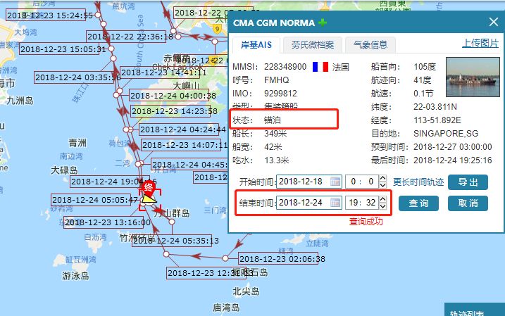 12月24日凌晨4点左右,珠江口A1 A3浮附近,达飞轮船旗下的一艘9145TEU名为“CMA CGM NORMA”的大型集装箱船(出港)与悬挂中国旗的一艘名为YUSHENG366的船舶发生碰撞。本次碰撞事故造成YUSHENG366轮沉没,全体船员弃船。