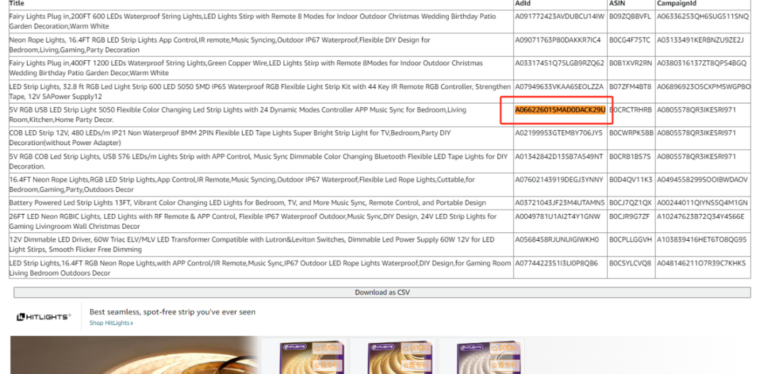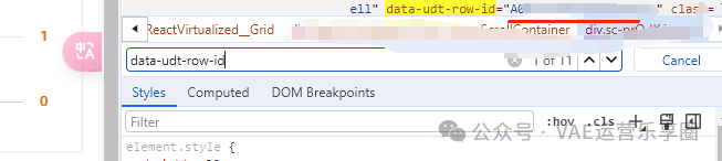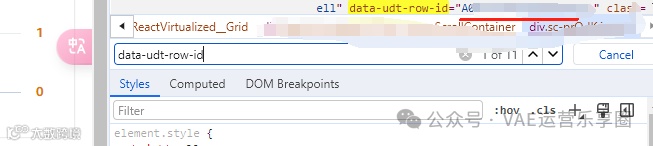 注意:针对一个广告活动组投放多个SKU的情况,我们后台搜data-udt-row-id的时候会匹配出来多个Adid. 解决办法:按F12(或者鼠标右键--检查),点击右上角的“光标”--选中SKU/Asin栏目下的整个模块(你要查询SKU的)---这个时候侧边栏目data-udt-row-id后面一连串代码就是这个SKU对应的adid