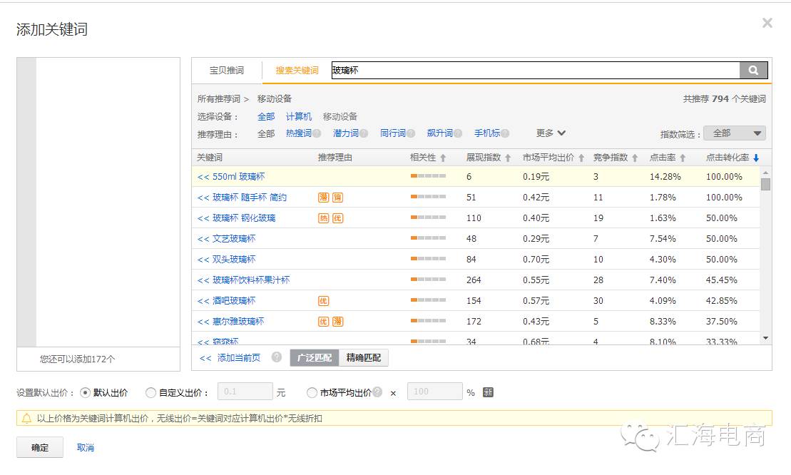 这里值得注意的一点是,根据杯子去搜索关键词,展现出来的都是属性词,但玻璃杯搜索出来的词又不一样。选词完成之后,可以看到关键词的质量分一般都是做5~8分左右,这个影响不是很大。记住选词不要太多,词太多其他的词会拉低整体直通车的权重。