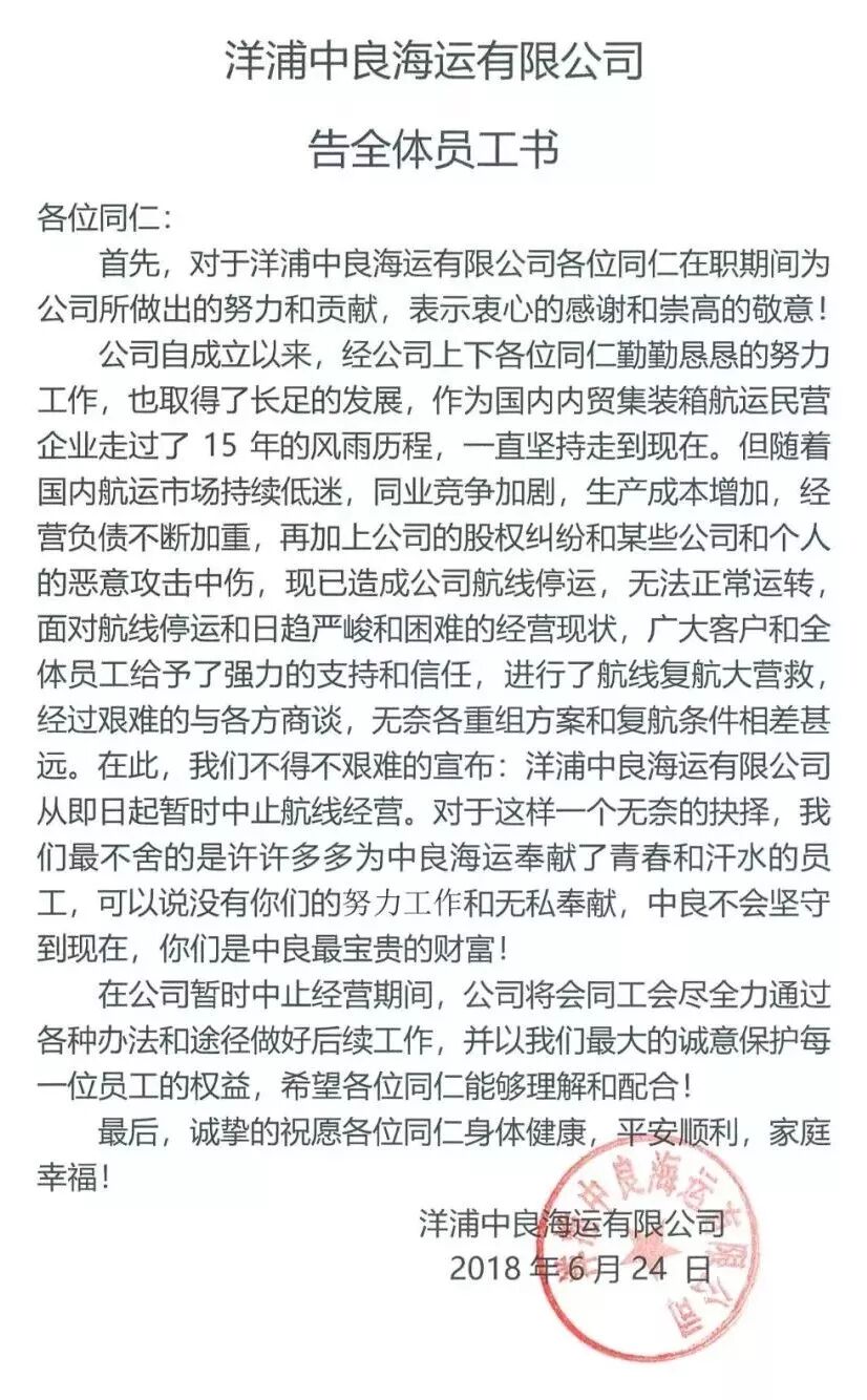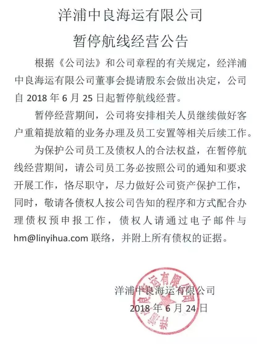 近期处于风尖浪口的洋浦中良海运,于6月24日官方连发四份公告和通知,宣布这家经营了近15年的中国内贸航运企业,从6月25日起暂停所有航线经营!