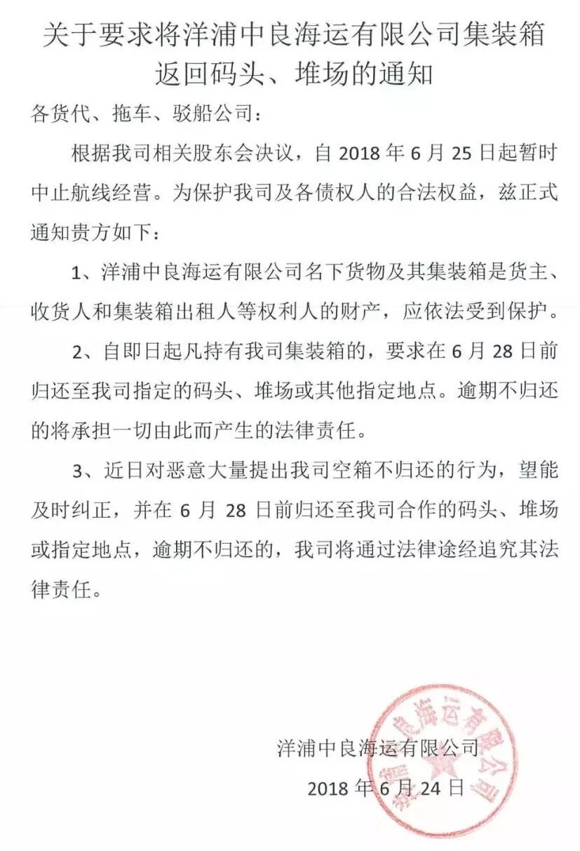关于洋浦中良海运有限公司集装箱停止流转的通知