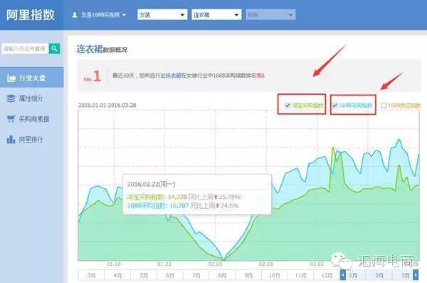 大家可以看一下,这个是类目的一个采购指数,分为淘宝采购指数和阿里巴巴采购指数,两个指标基本吻合,这个就能很好的替代以前淘宝指数了,而且更准确。