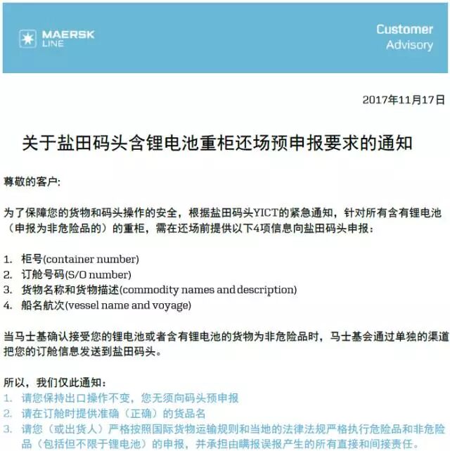 为防止此类事故再度发生,马士基发布盐田码头含锂电池重柜还场预申报要求的通知,具体如下: