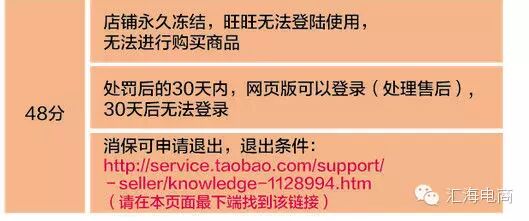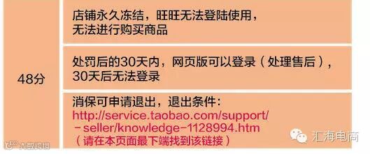 48分:店铺永久冻结,旺旺无法登录使用,无法进行购买商品。处罚后的30天内,网页版可以登录(处理售后),30天后无法登录。消保可申请退出,退出条件