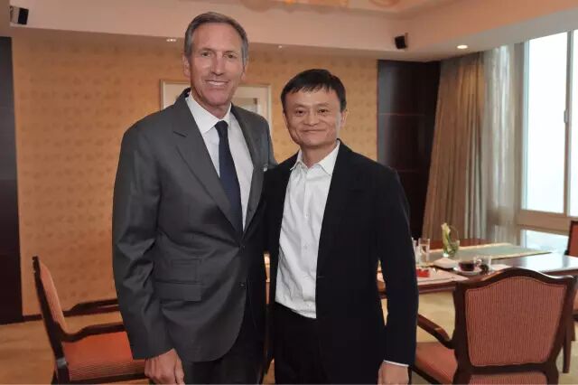▲阿里巴巴集团董事局主席马云同星巴克咖啡公司主席兼CEO霍华德