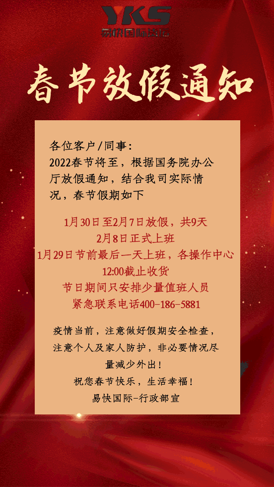 因春节放假,如果给您带来不便,敬请谅解!希望您在新的一年里继续支持YKS易快国际货运,愿我们的合作更加紧密,愿我们的事业更加辉煌!