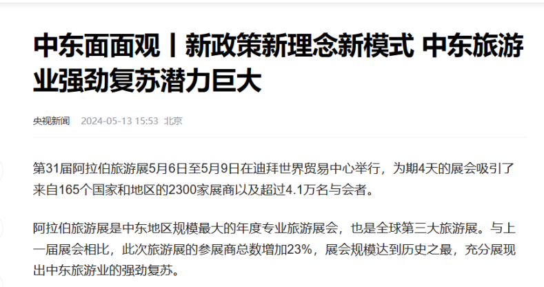 不仅仅是阿联酋,越来越多的中东国家认识到旅游业对于发展经济和提升就业的重要性,并开始把旅游业作为国家经济发展的战略重点。多个国家推出诸多旅游振兴举措,投资建设旅游项目,推动旅游资源的开发和旅游产品的升级,开发体育旅游、会展旅游等新业态新模式,促进本国经济的多元化。