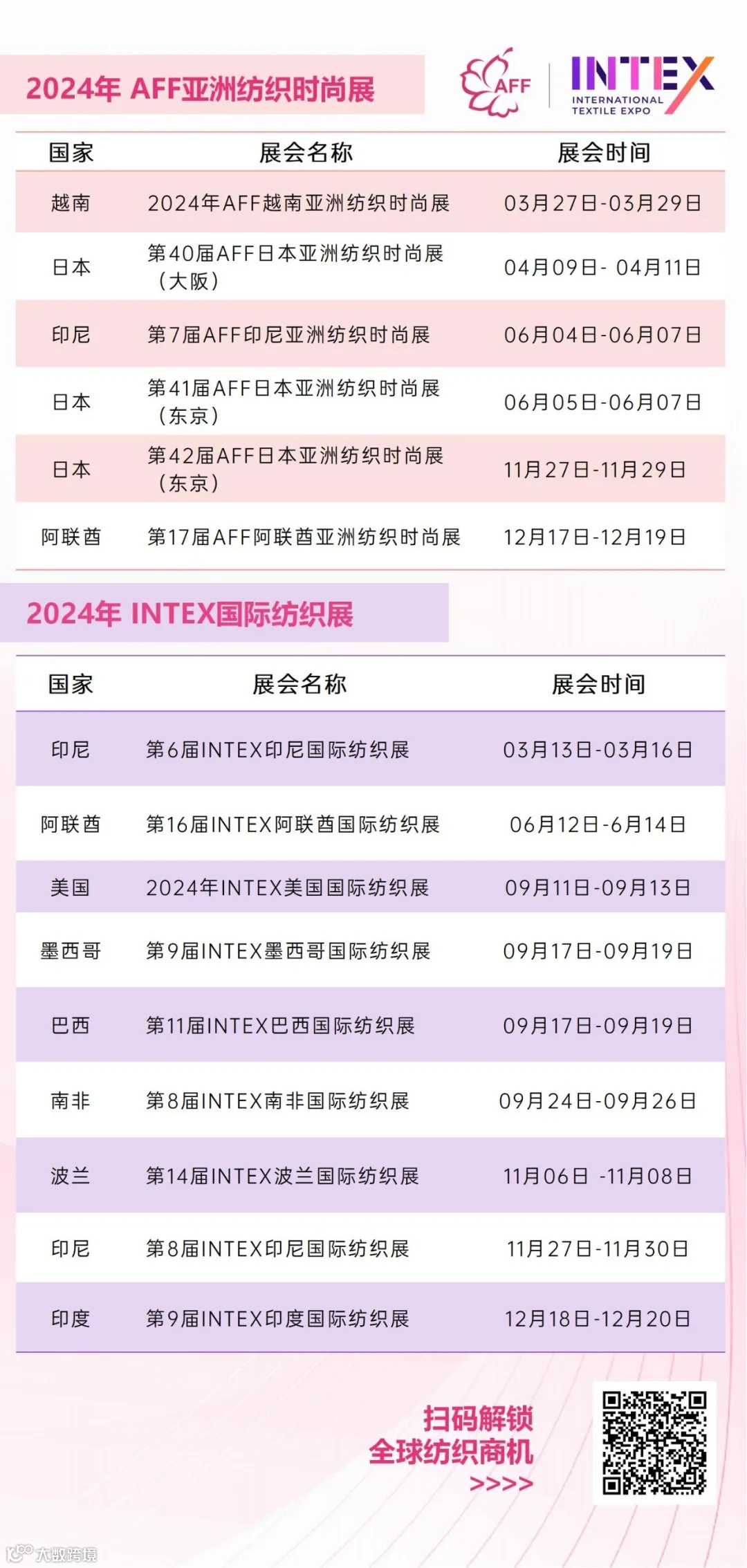 2024年,AFF&INTEX国际纺织展将在越南、印尼、阿联酋、土耳其、日本、德国、美国、南非、印尼、波兰、墨西哥、巴西、阿联酋、印度等全球重点纺织地区举办15+场专业纺织服装展,展品范围涵盖原材料、纱线、面料、辅料、服装服饰、家纺及面料、箱包、鞋业、纺织机械、纺织设备等各细分领域,聚焦一带一路、RCEP、金砖国家经济带,发掘新兴市场商机!
