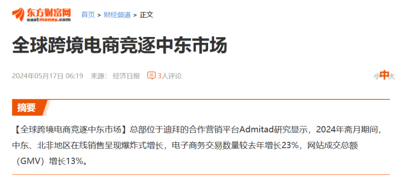 总部位于迪拜的合作营销平台Admitad研究显示,2024年斋月期间,中东、北非地区在线销售呈现爆炸式增长,电子商务交易数量较去年增长23%,网站成交总额(GMV)增长13%。