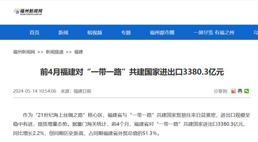 前4月福建对“一带一路”共建国家进出口3380.3亿元