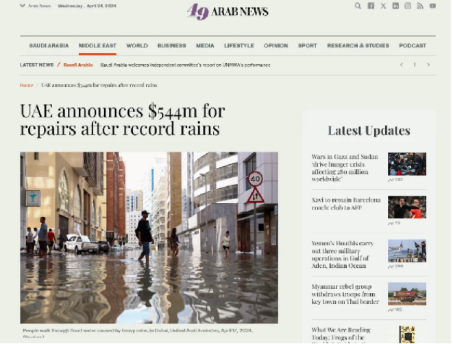 “4月16日至17日,阿联酋遭遇75年来最大降雨,迪拜等多个城市交通受到影响。据美联社报道,24小时里,迪拜降雨量超过142毫米。”