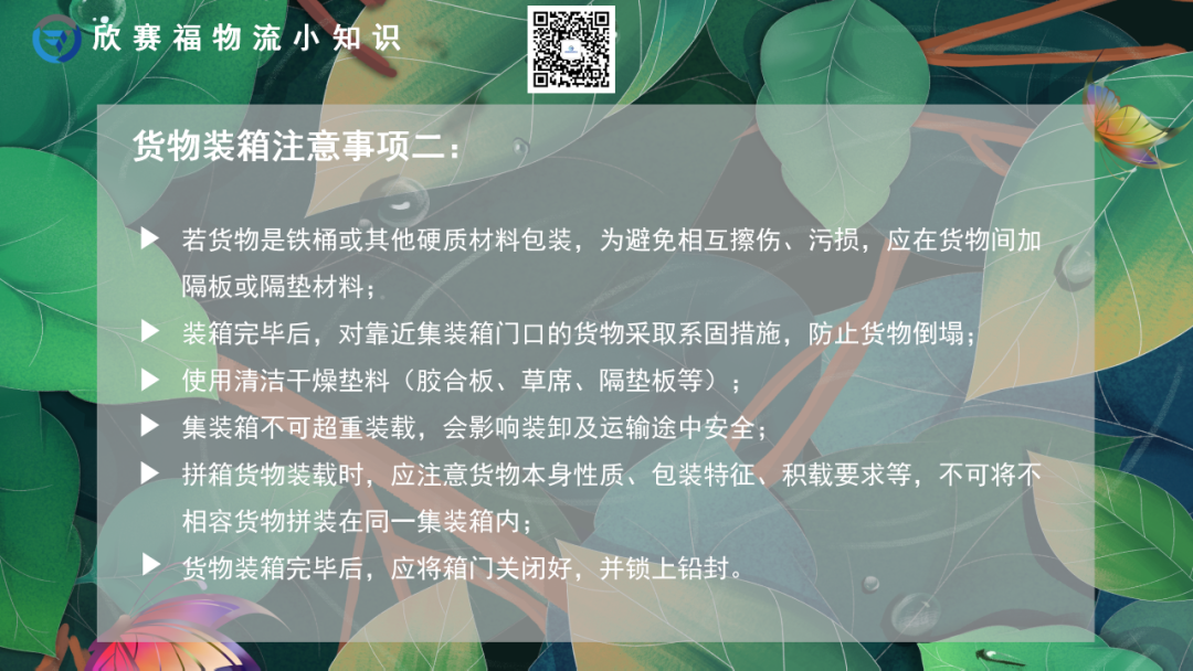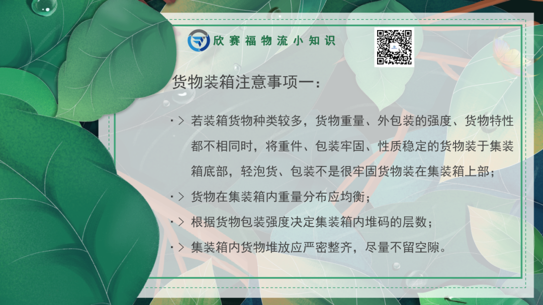 集装箱在装箱过程中需要注意货物的种类、包装、特性、货物固定与防护等方面的事项。