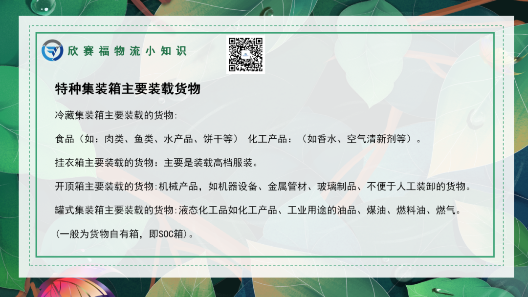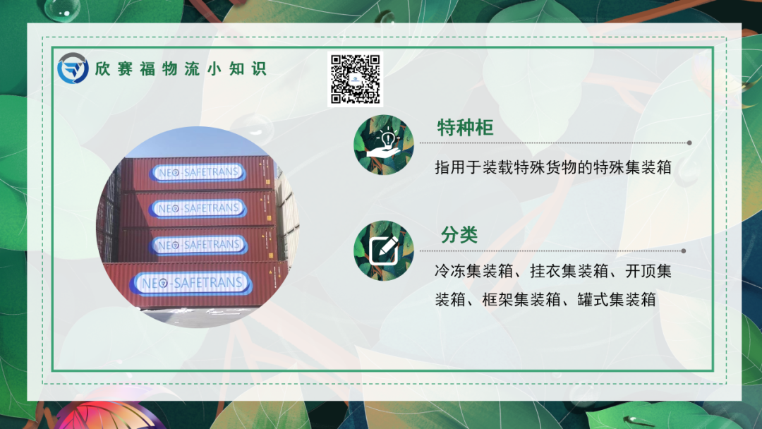 特种柜就是比普柜特殊的特殊集装箱,其特殊性体现在可以是有冷藏、接超宽超高货物、接活体牲畜、接各种液体、接车辆、接服饰等功能的总称。