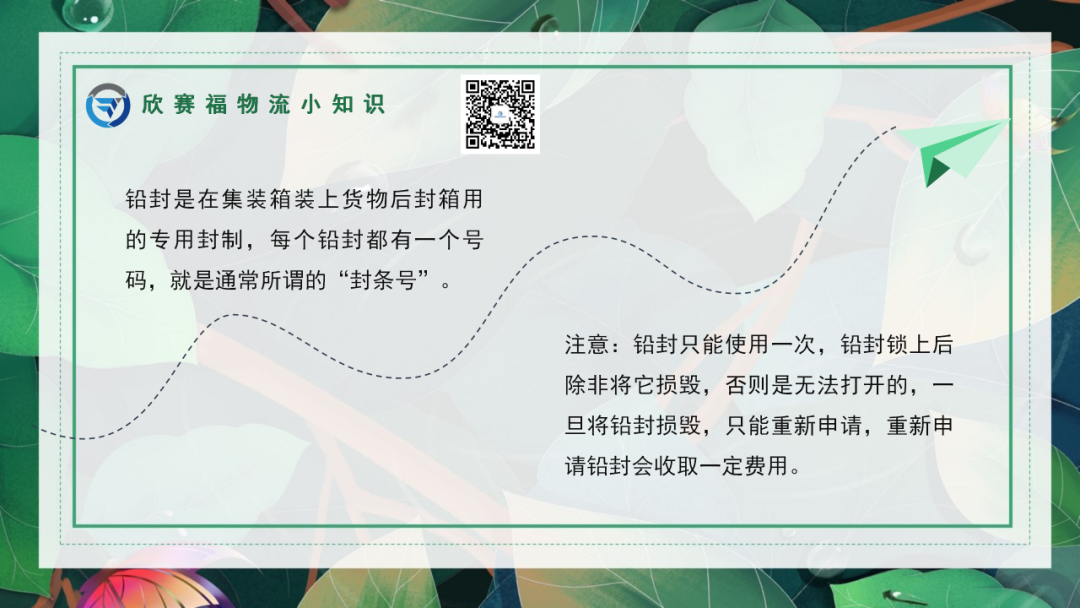铅封是货物装入集装箱并正确地关闭箱门后,由特定人员施加的类似于锁扣的设备,一经正确锁上,除非暴力破坏(即剪开)则无法打开,破坏后的铅封无法重新使用。