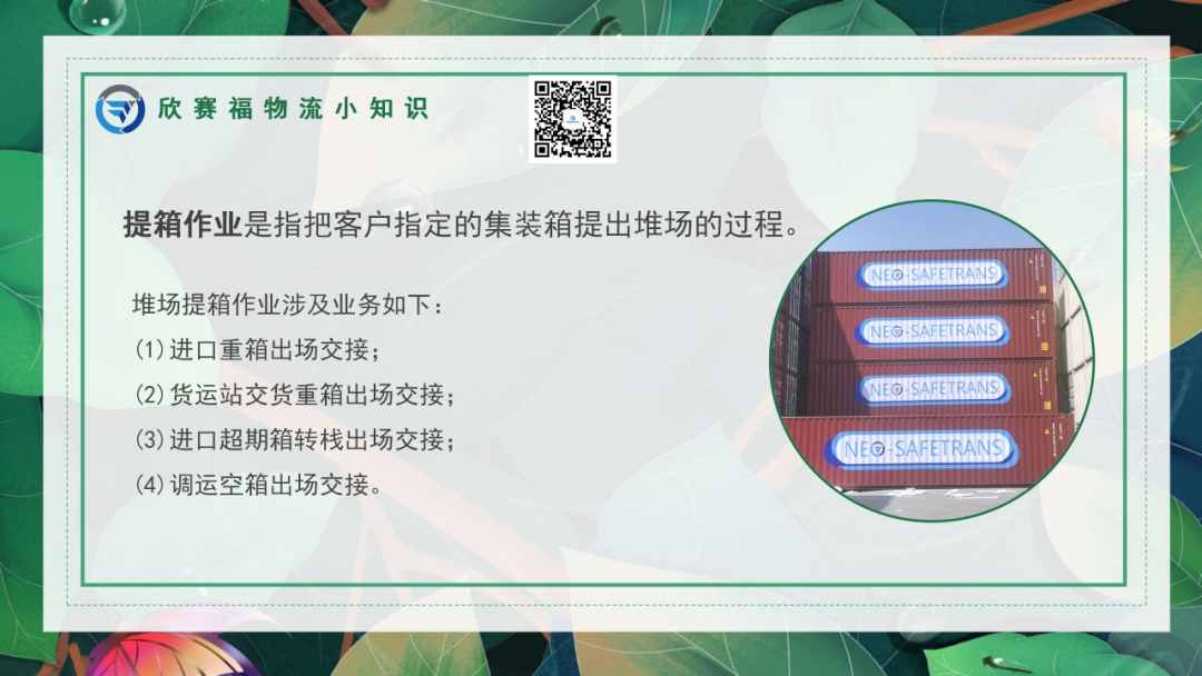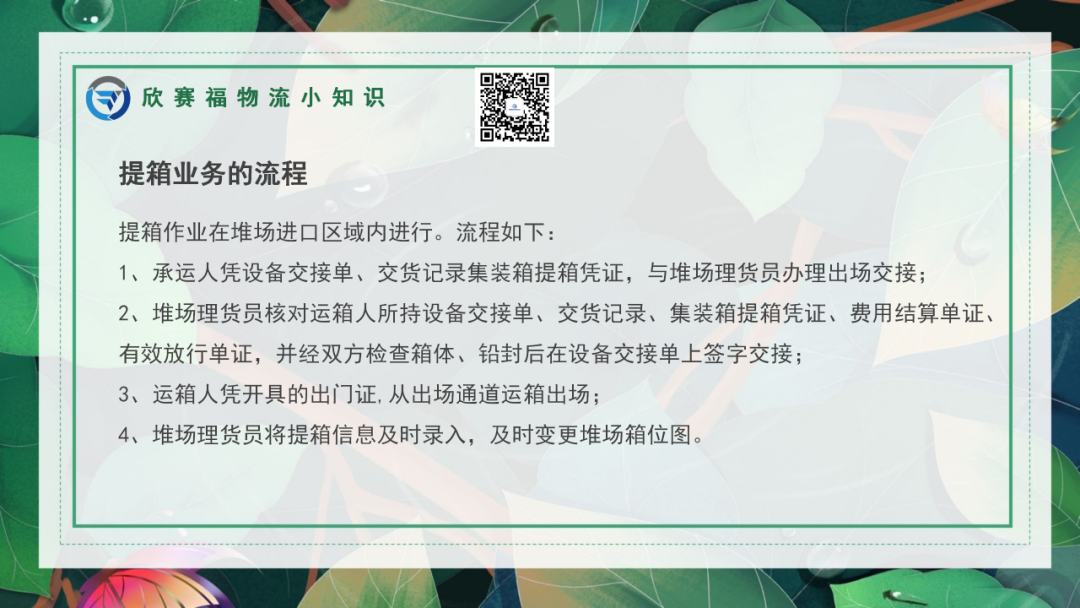提箱业务流程主要包括预约、获取提货单据、办理提箱手续、安全检查、提取集装箱、离开堆场等步骤。