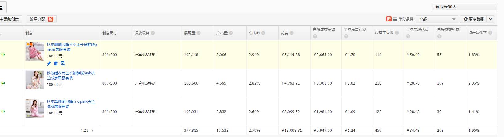 一张好的创意图片可以让直通车的点击暴增,好多朋友问我,直通车开起来,没点击,点击花费高,那是因为你没有一张好的创意,其实只要点击率上去了,点击花费自然就降下来,就拿我现在手上的一家睡衣店来说吧,刚刚接手的时候点击率在0.5现在点击率2.5左右,其实我就换了一个角度去开,然而点击就飙升起来了,像非标品的类目,大家一定要去多测试产品的各个角度,说不定你的点击就起来了,除非是你的产品真的不行。