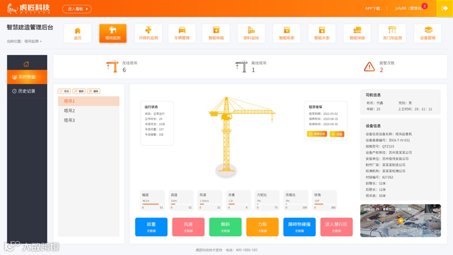 虎匠塔吊监测系统是综合运用传感器技术、嵌入式技术、数据采集技术、数据处理技术、无线传感网络与远程通信技术,通过前端监控装置和平台无缝对接,将塔机运行数据和报警信息实时发送到远程GIS可视化监控平台,实现数据分析反馈,辅助驾驶员安全规范操作,有效避免塔机安全隐患,安全看得见。