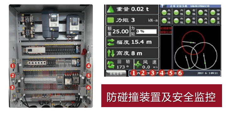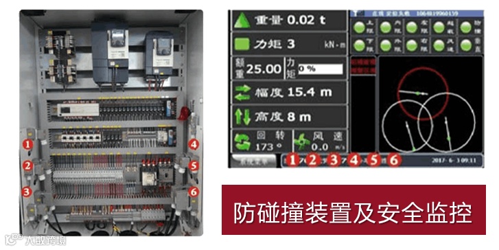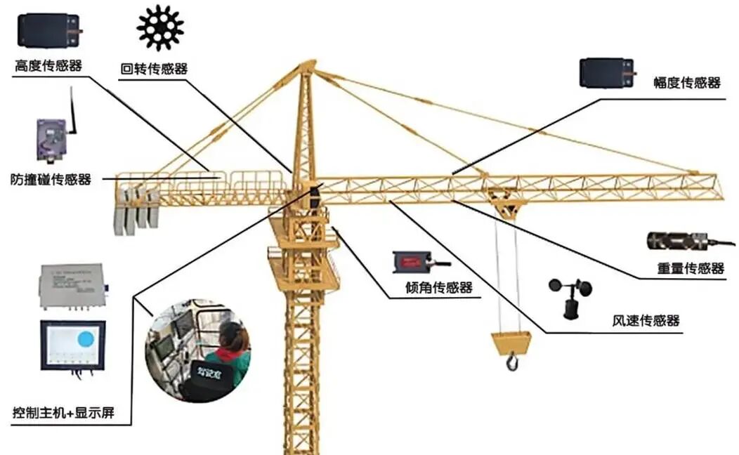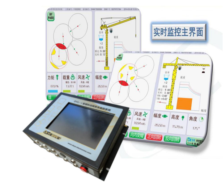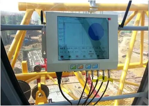 通过传感器监督使用单位可以实时监控塔吊的运行情况,安装拆卸使用的时间以及记录运行全过程,实时向操作者显示塔机当前的起重量、幅度、力矩和起升高度等参数。在达到额定载荷的90%时,系统发出报警,超过额定载荷时,系统自动切断危险方向工作电源,强迫终止违章操作。