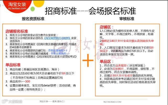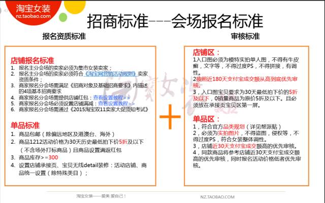 9.15店铺卖家招商正式开始,在满足基础标准后,女装类目主要分标签卖家和非标签卖家,三钻以上方可申请。非标签卖家参照近180天成交金额由高到低优先审核,此外,有详细大促规划以及目标,且调性较高可享受优先审核。