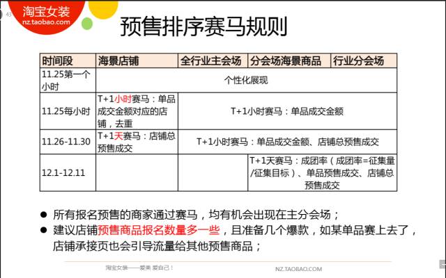 关于排序赛马规则,举例来说假如会场有100个坑位,预售商品招了1000个,1000个商品会提前赛马,产生Top100产生,所有报名预售商品通过赛马,均有机会出现在主分会场,因此建议商家在预售限定的报名数量范围内尽可能多地去报名商品。
