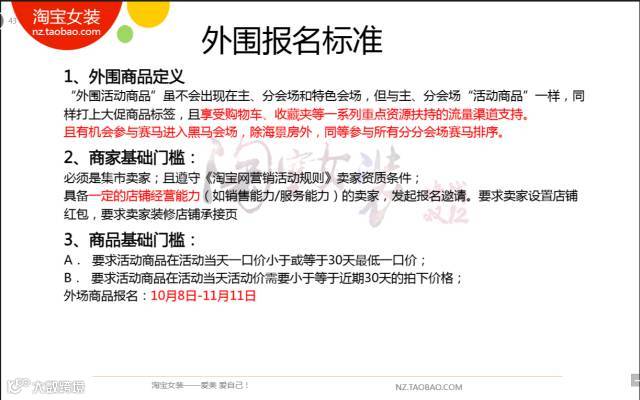 外围报名时间为10.8-11.11,“外围活动商品”虽不会出现在主、分会场和特色会场,但是享有购物车、收藏夹等一系列重点资源扶持的流量渠道支持。且有机会参与赛马进入黑马会场。
