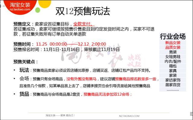 预售时间11.25 0:00:00——12.12 2:00:00,预售只有会场商品,没有外围没有黑马,预售商品无法参加双12会场。