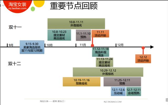 第一个节点是9.15,是双11和双12一个店铺的海选,截止到9.30号;10月8号会开始行业会场报名;11.13是双12候补报名,店铺红包的玩法设置,需要在此之前完成;预售的报名的时间在10.19-11.16;12.1整个会场的预热,1号会开始一些小互动和玩法,7号正式会场预热。