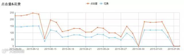 它的使用很简单,只要我们把热销宝贝选中,设置好日限额,一键推广就可以了。经过一段时间的推广,可以从后台数据看出点击和花费的折线图,数据一目了然。