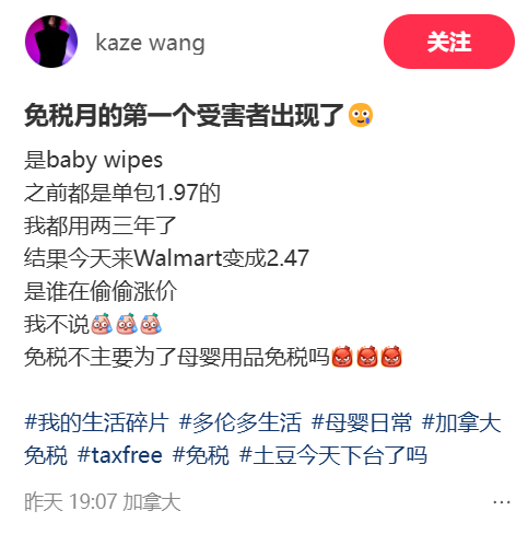多伦多华人网友@kaze wang发现,一款她用了两三年的婴儿湿巾,竟从原来的1.97加元偷偷涨到了2.74加元。