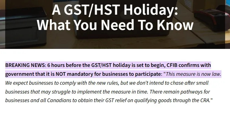 CFIB在面向商家的声明中声称:“此项措施已正式成为法律。我们期望企业遵守新规,但不会追究那些可能难以及时实施措施的小企业。加拿大税务局(CRA)仍为企业和所有加拿大人提供获取符合条件商品GST减免的途径。”