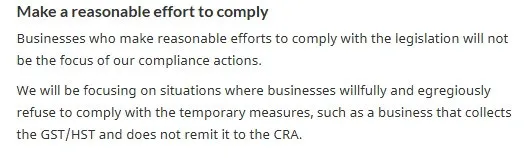 CRA表示:“我们的重点将放在蓄意且严重拒绝遵守临时措施的情况,例如某些企业收取GST/HST却未向加拿大税务局(CRA)上缴。“