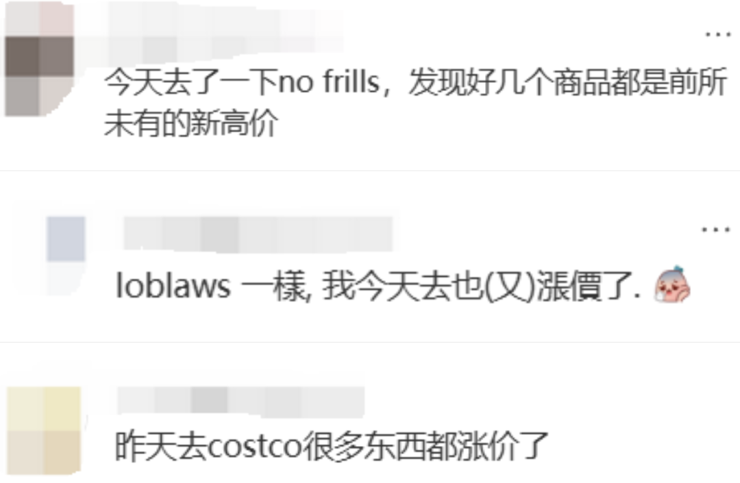 一些网友则在No Frills、Loblaws、Costco等超市发现很多商品都涨价了,真是达到了前所未有的新高价。