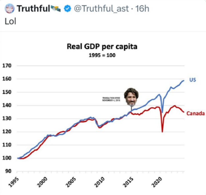 是这样的,一开始是有网民在自己的X账号Po出一张图,对照加拿大和美国从1995年到现在的人均GDP对比图。