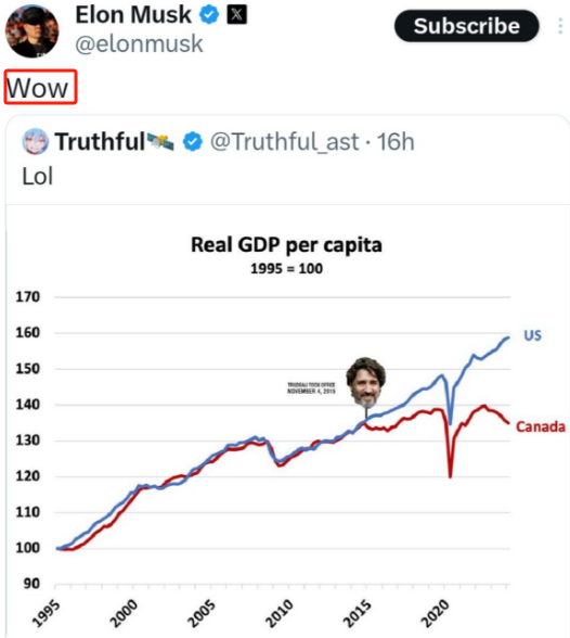 加拿大这经济,就连之前大喊“我爱加拿大”的马斯克都看不过眼了,直接在X上表示:特鲁多必须下台!