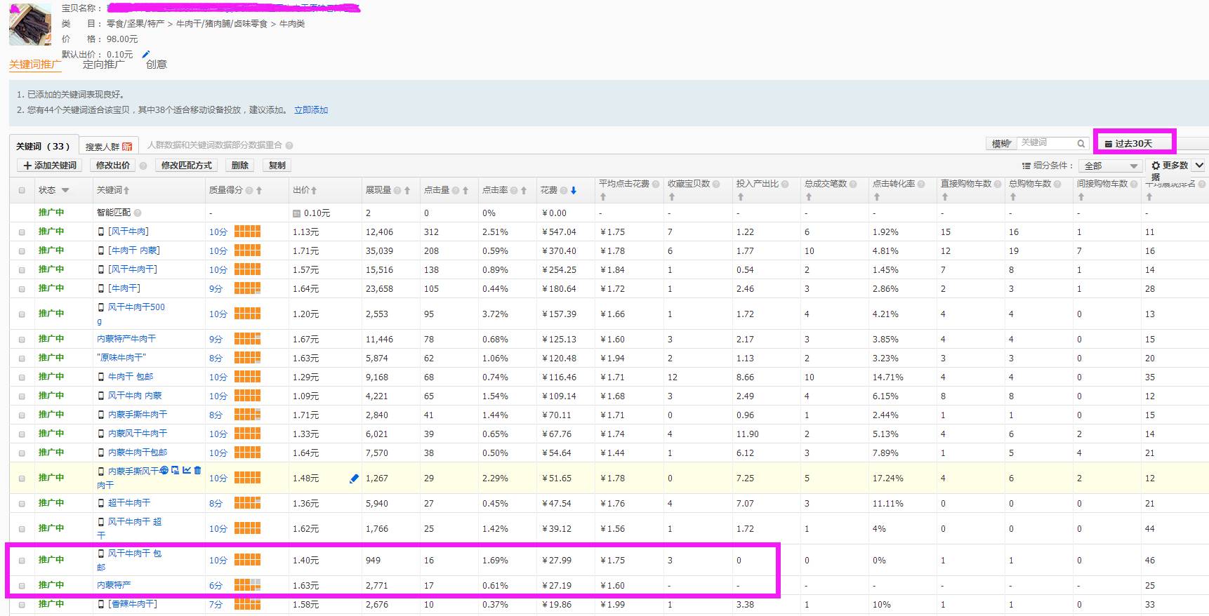 以下是一个卖牛肉干的店铺在淡季利用直通车引流配合营销活动实操的案例: