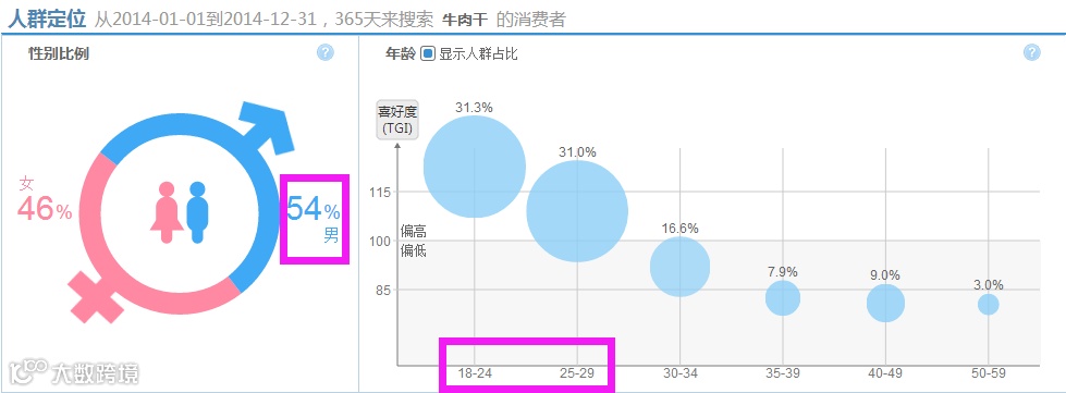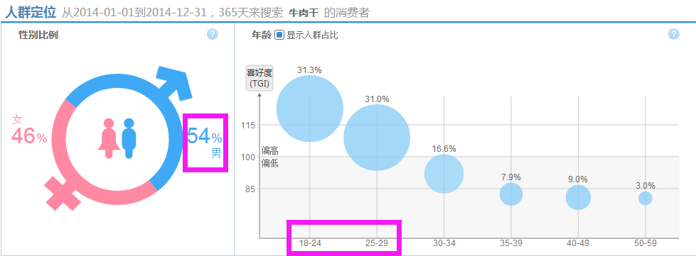 查看去年同时段的购买人群:男性性别占比是54%,年龄层主要集中在18-29岁,消费水平集中在中等。依据以上数据和结合自己店铺的宝贝情况,可在直通车后台设置自定义搜索人群,以实现人群精准定位。