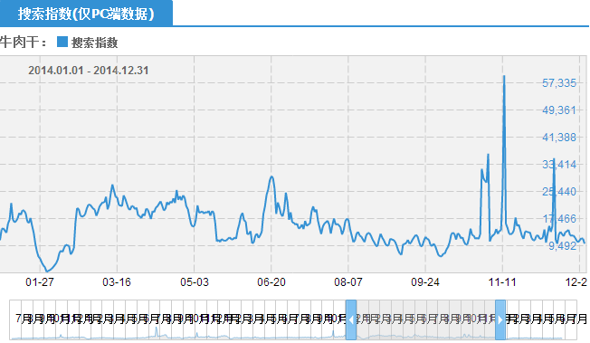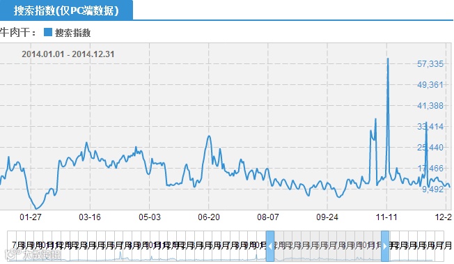 从上图可看出,牛肉干在2014年6月中旬就开始下滑,逐渐进入淡季了,到9月下旬开始上升,10月份是一个旺季,双11和双12各出现了一个峰值,在淡季的第一个月(7月)和第二个月(8月),争取减少库存积压。