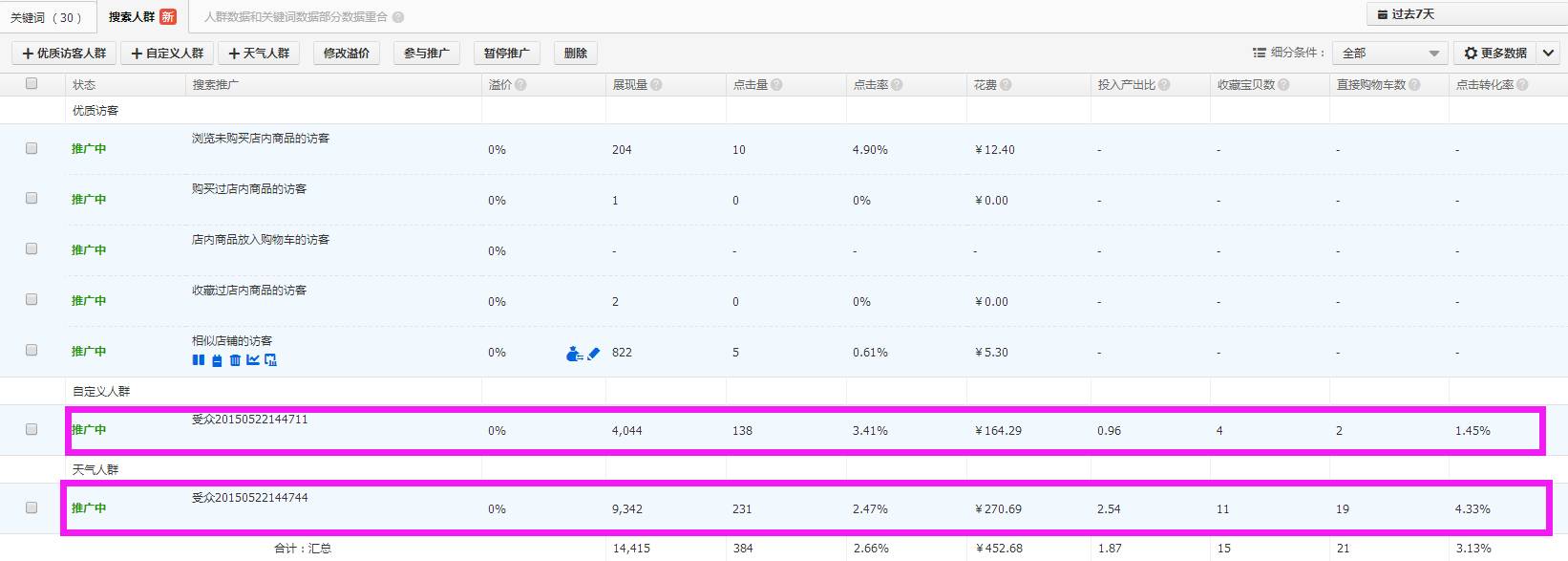 根据数据,设置好性别、年龄、和消费额度的人群,以及溢价比例,优化后数据效果如下: